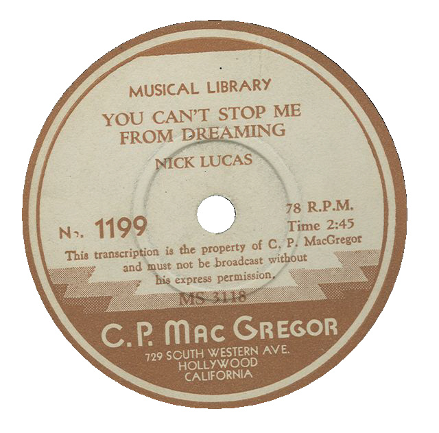 After Nick Lucas left Brunswick in late 1932 he recorded for several labels and also recorded for some transcription companies including MacGregor,(around 1937) and